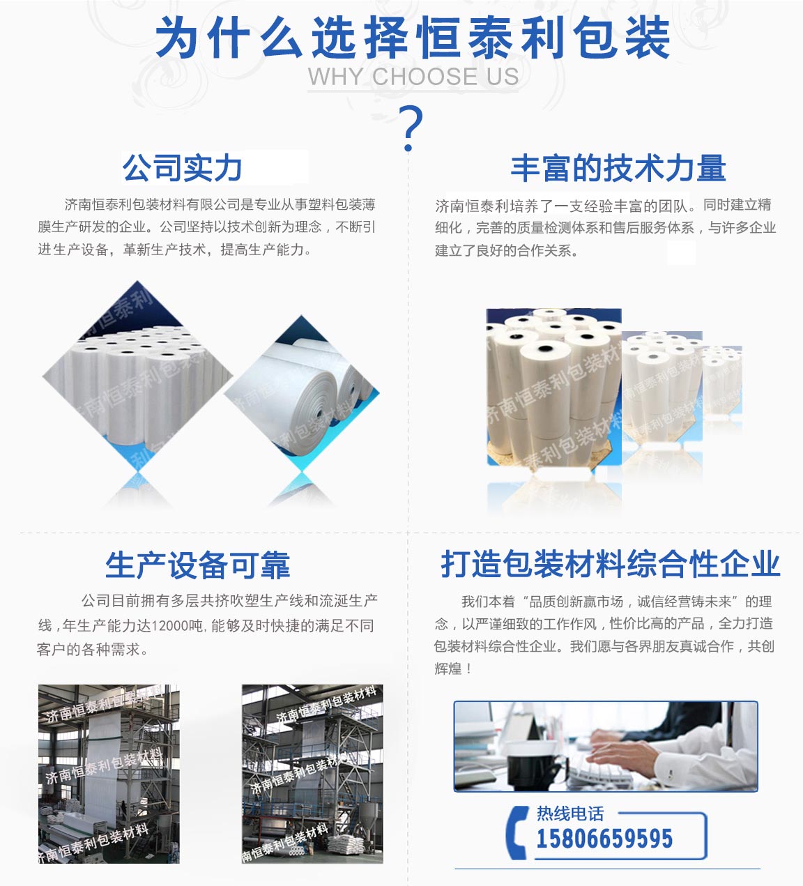 濟(jì)南恒泰利包裝材料有限公司位于濟(jì)南市市中區(qū),是從事塑料包裝薄膜生產(chǎn)研發(fā)的企業(yè)。公司成立十幾年以來,堅(jiān)持以技術(shù)創(chuàng)新為理念,不斷引進(jìn)生產(chǎn)設(shè)備,革新生產(chǎn)技術(shù),提高生產(chǎn)能力。并堅(jiān)持自主創(chuàng)新,加強(qiáng)企業(yè)管理,培養(yǎng)了一支經(jīng)驗(yàn)豐富的團(tuán)隊(duì)。同時企業(yè)建立高標(biāo)準(zhǔn)、精細(xì)化質(zhì)量檢測管理體系和完善的售后服務(wù)體系,與國內(nèi)外許多家企業(yè)建立了良好密切的合作關(guān)系。公司目前擁有多層共擠吹塑生產(chǎn)線和流延生產(chǎn)線,年生產(chǎn)能力達(dá)12000噸,能夠及時快捷的滿...